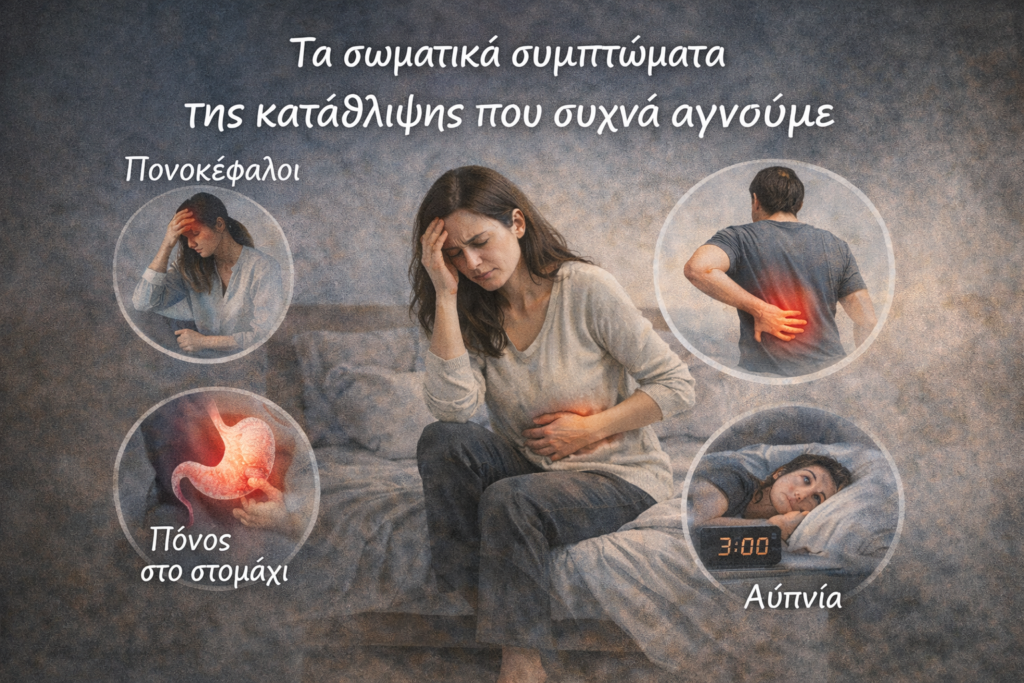 Η κατάθλιψη δεν εκδηλώνεται μόνο ψυχικά. Πολύ συχνά το σώμα είναι το πρώτο που «μιλά». Πολλοί άνθρωποι απευθύνονται αρχικά σε γιατρούς για σωματικά